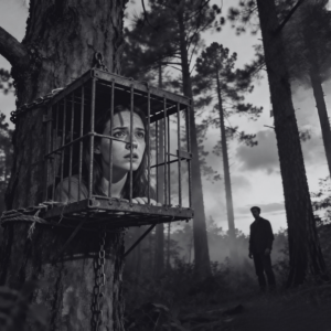 la jaula fue soldado al tronco de un grueso abeto. Las varillas rodearon el árbol. Los cierres eran sólidos. el toda la estructura estaba cubierta de vides y uvas silvestres como si la naturaleza fuera tratando de ocultarlo. La puerta de la jaula estaba cerrado con un candado. En el interior había un cuerpo.