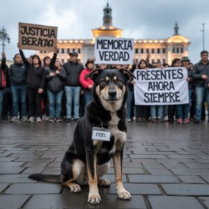 Entre las banderas blancas, entre las pancartas con nombres escritos en letras negras, apareció un perro. Su pelaje era oscuro, con canas en el hocico, sus ojos reflejaban un cansancio antiguo, como si llevara años caminando. Colgado de su collar había una foto plastificada: “Carlos Romero. 56 años. Desaparecido el 3 de may