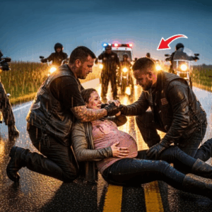 El convoy se transformó en una unidad de rescate de alta velocidad. Nine, un gigante silencioso, protegió a Mara con su chaqueta; Stitch, el médico de carretera del grupo, la estabilizó en una furgoneta de persecución improvisada. La llegada al Hospital del Condado de Ridgewater fue una escena de película: motos relucientes, cuero empapado y hombres curtidos por el clima que custodiaban a una mujer en una camilla.