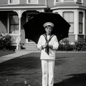 Estás mirando una fotografía tomada en Agosto de 1910. Un niño de unos 7 años. viejo se encuentra solo en lo que parece el Patio delantero de una casa de estilo victoriano. el Viste un traje de marinero formal y sostiene un gran paraguas negro, aunque el La foto fue tomada claramente con una luz iluminada.