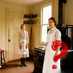 La imagen mostró dos figuras femeninas en una casa interior. Una mujer mayor, tal vez en su 40 años, estaba de pie con las manos entrelazadas Frente de una estufa de hierro fundido. el La estufa era una estufa majestuosa, del tipo anunciado en catálogos de esa época como el orgullo de cualquier cocina de granja. a a su izquierda y ligeramente detrás, una chica de tal vez 14 o 15 se paró con la barbilla elevado, vestido con un vestido de trabajo claro y una delantal blanco.