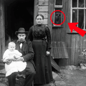 Un hombre con traje y sombrero negros estaba sentado en un escalón de piedra, sosteniendo a un bebé con un vestido de bautizo. Detrás de él, una mujer, con expresión rígida e inmóvil, enmarcada por una cabaña de madera tosca. Fue el rostro en la ventana lo que rompió la tranquilidad de la imagen.