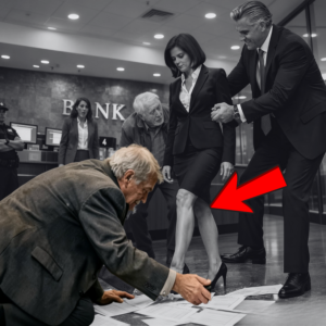 Luego empujó las hojas hacia él con la punta del zapato. “Tome su basura”, dijo, “y no vuelva.” En ese instante, la puerta giratoria del banco se abrió. El murmullo general se apagó poco a poco. Un hombre alto, de traje oscuro impecable, avanzó con paso firme, acompañado por dos asistentes. No miró los anuncios ni el tablero de turnos.