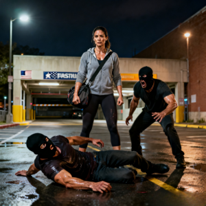 Cerró los ojos brevemente, respiró. Entonces sacó su teléfono. Sus dedos no temblaban. Ella marcó el número con calma. 911. Sí, soy Lisa Carter. 327 Jefferson Street. A la entrada del estacionamiento subterráneo. Me atacaron dos hombres armados. Quedaron incapacitados. Estoy lesa. La espero. Colgó, guardó el teléfono y permaneció allí bajo la pálida luz de la calle derecha, tranquila, con la mirada vuelta hacia la noche.