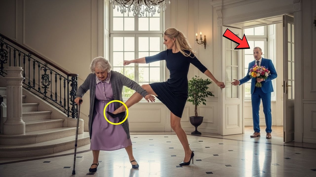 Doña Zulema, pequeña y frágil, se apoyaba en el bastón artesanal que Renato le había traído de Valparaíso, encogiéndose contra la pared. Camila, impecablemente vestida, estaba de pie junto a ella. En un momento de pura malicia desdeñosa, Camila levantó el pie y pateó el bastón, haciéndolo resbalar por el suelo y obligando a la anciana a tropezar.