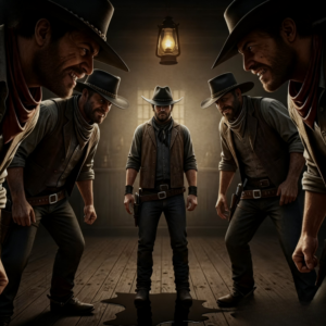 “Los matones se burlan de un vaquero silencioso, sin saber que es el pistolero más letal del Oeste