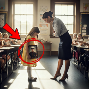 Sus manitas temblaban mientras bajaba la foto. El dolor se grabó profundo en su rostro. Pero antes de que la maestra pudiera sonreír con satisfacción, la puerta del salón se abrió de golpe con un sonido pesado. Un marine alto entró con su uniforme completo y a su lado marchaba un imponente perro K9. Todos los niños se quedaron en silencio y el rostro de la maestra se puso blanco como el papel.