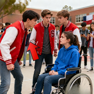 Maya avanzaba despacio entre la gente en su silla de ruedas con una sudadera azul y los audífonos colgando del cuello. No buscaba atención, solo quería llegar a la rampa lateral donde su hermano solía esperarla para irse juntos. Pero ese día el camino se le cerró. Tres chicos con chamarras deportivas rojas se pararon frente a ella como si el patio fuera suyo.