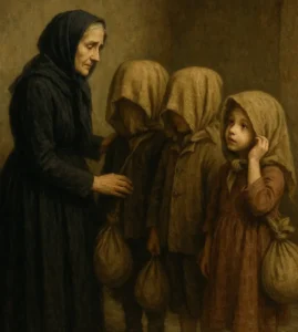 Y justo entonces llamaron a la puerta. Tres golpes secos y luego nada. Marta se quedó inmóvil. Los chicos alzaron la cabeza. Ella caminó hasta la puerta, la abrió con cautela y allí estaba el reverendo Jacob Estoques, alto, delgado, con un abrigo negro y las manos cruzadas, como si rezara incluso cuando no hablaba. “Buenas tardes, Marta”, dijo con voz baja.