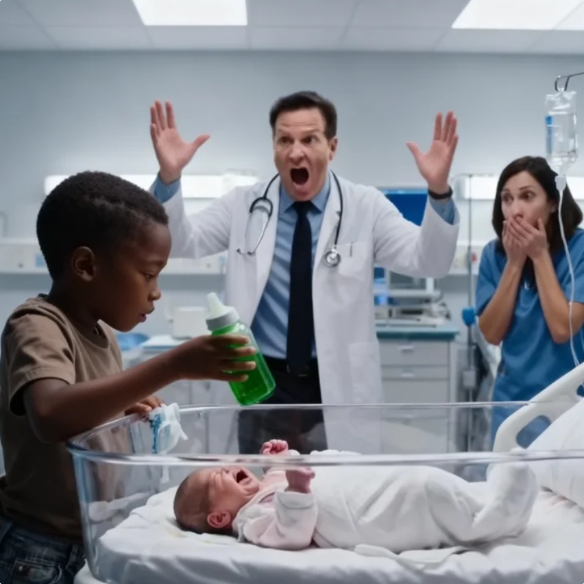 El señor Derek se quedó inmóvil, mirando la pared, luego la cuna, luego a Liam: aquel muchacho de la calle, delgado, con ropa gastada y un frasco casero en el bolsillo, la única persona en la habitación que había escuchado de verdad al niño.