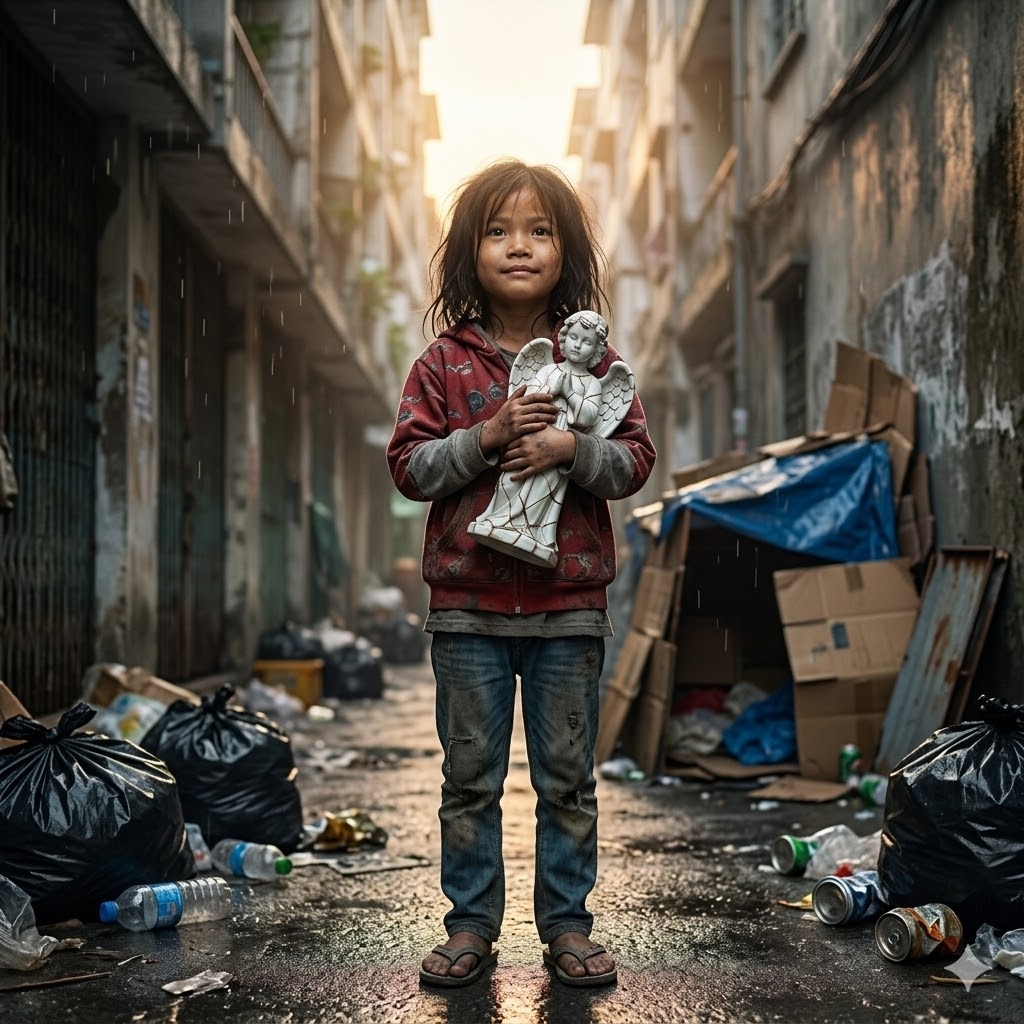 Near a pile of discarded junk, a small girl crouched quietly, carefully picking through scraps with unusual focus in her eyes.