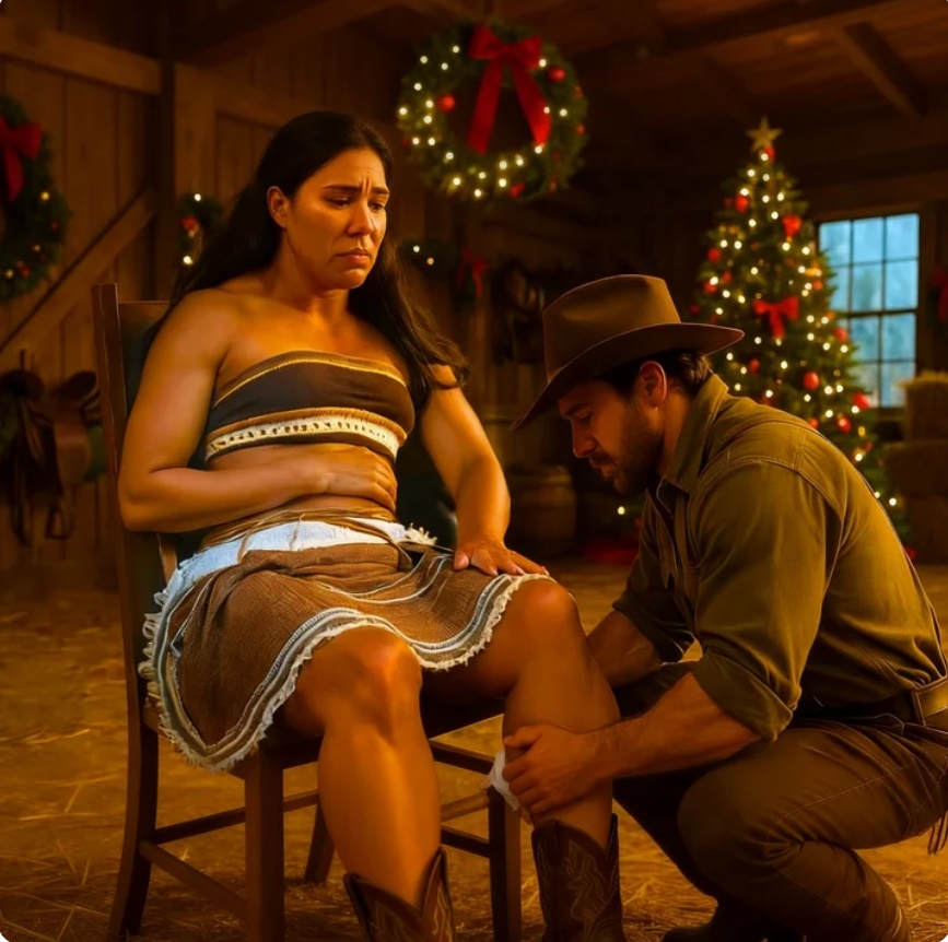 Dentro de la cabaña iluminada por velas, el árbol de Navidad brillaba con cintas rojas y ramas de pino recién cortadas. Frente a él, Tobías Brenan —vaquero solitario, viudo desde hacía tres inviernos— estaba arrodillado sobre el suelo de madera.
