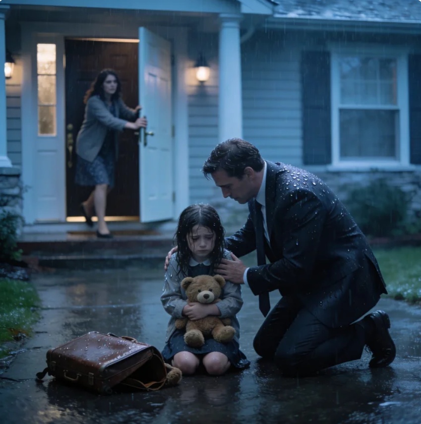 She fell to her knees on the driveway, trembling, her belongings scattered around her, clutching her teddy bear like it was the only thing keeping her from falling apart completely.