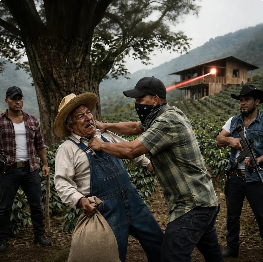 La respuesta le costó el primer golpe. Cayó de rodillas sobre la tierra húmeda. Rayo se lanzó con furia contra uno de los agresores, alcanzó a morderlo antes de recibir una patada brutal que lo hizo rodar entre el polvo. Los hombres rieron. Luego vino otro golpe, esta vez contra el rostro del anciano, abriéndole la ceja. Le exigieron entregar parte de la producción, someter el cafetal a su “administración”, aceptar que esa tierra ya no le pertenecía del todo. Don Esteban, con sangre mezclándose con barro en la mejilla, volvió a negarse.
