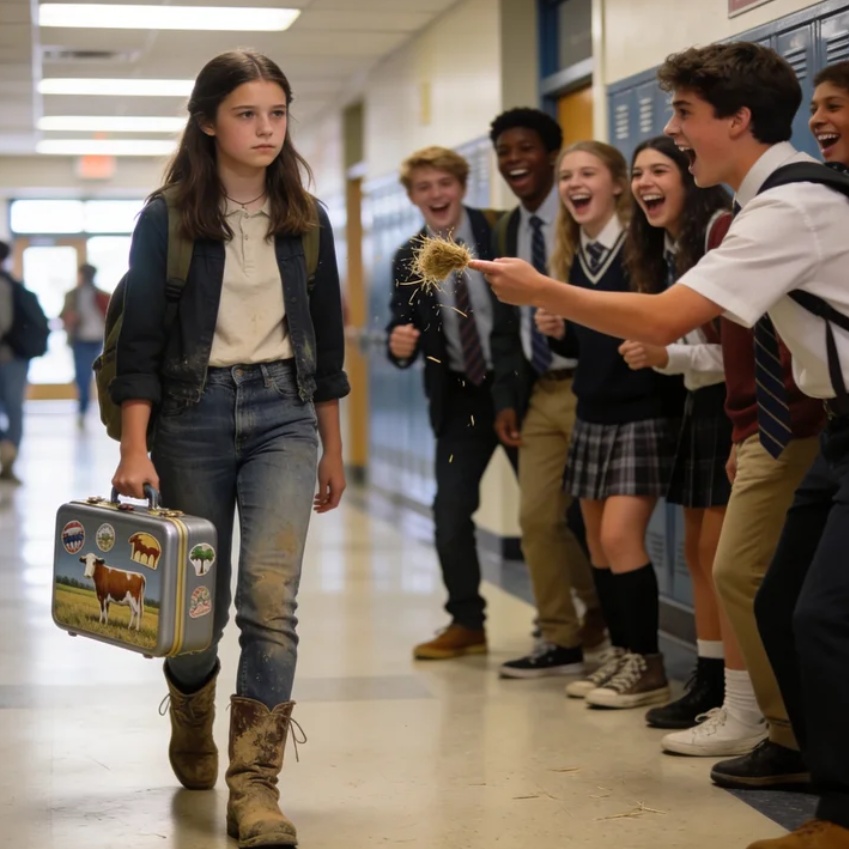 Lena Brooks stepped inside with her head slightly lowered, one hand gripping a worn lunchbox covered in faded farm stickers. Dust clung to the edges of her boots, and her jeans carried the quiet evidence of a morning spent working before most of her classmates had even woken up.