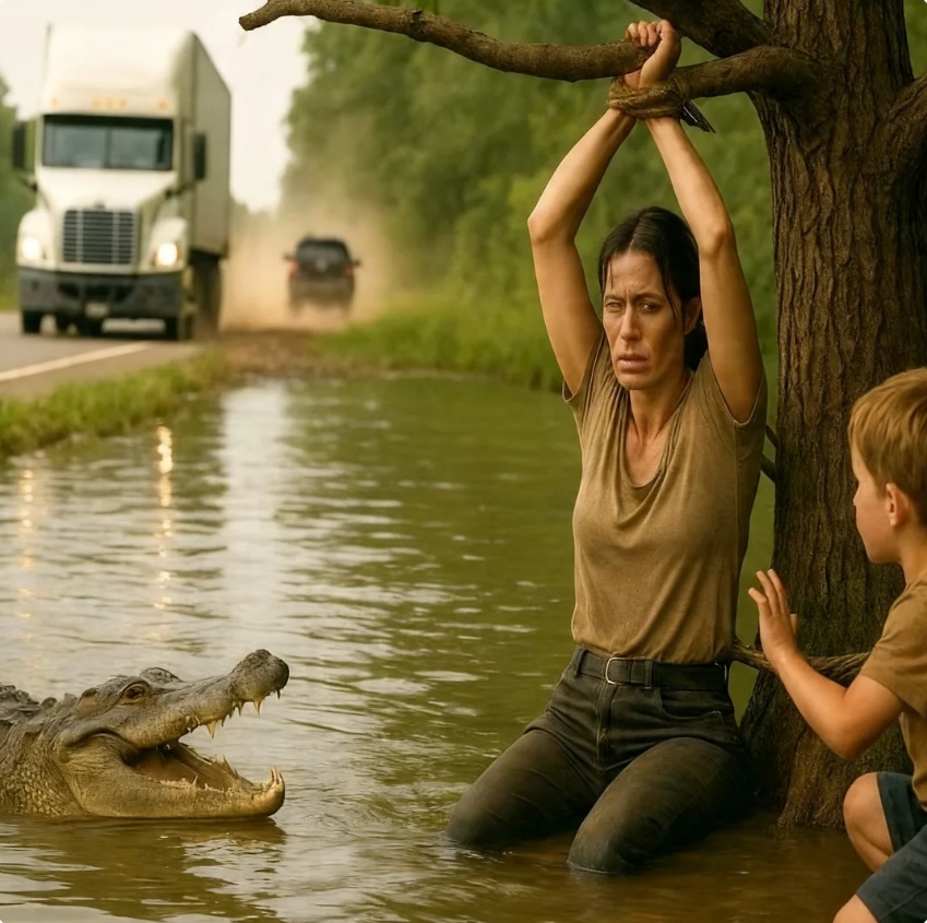Bajo la lluvia, atada a un árbol, había una mujer. Tenía el rostro amoratado, las muñecas sujetas con una cuerda gruesa y el cuerpo vencido hacia un lado. A pocos metros, entre los juncos del agua oscura, avanzaba un enorme jabalí herido y desquiciado, atraído quizá por el miedo, por la sangre o por el simple caos de la tormenta. Y no era todo. Escondido entre las zarzas, un niño pequeño tiraba de las cuerdas con manos temblorosas, llorando en silencio, demasiado débil para soltar a su madre.