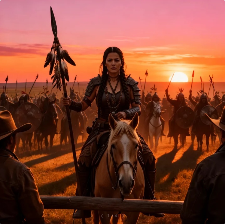 una mujer avanzó sola. Vestía ropa tradicional apache, adaptada para montar