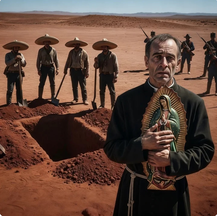 El sol caía como un castigo sobre la plaza, un sacerdote de rodillas, sotana