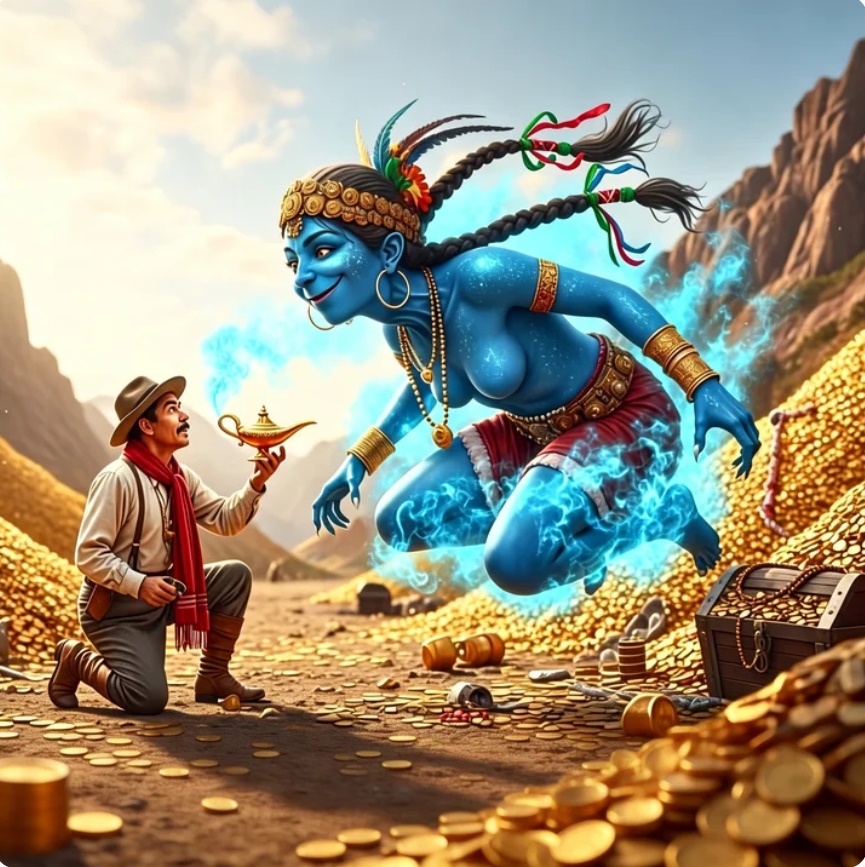 Una lámpara pequeña, dorada, imposible, entre las alforjas destrozadas. No era un espejismo. Estaba fría como hielo. Al frotarla, el humo azul estalló como un grito contenido por siglos.