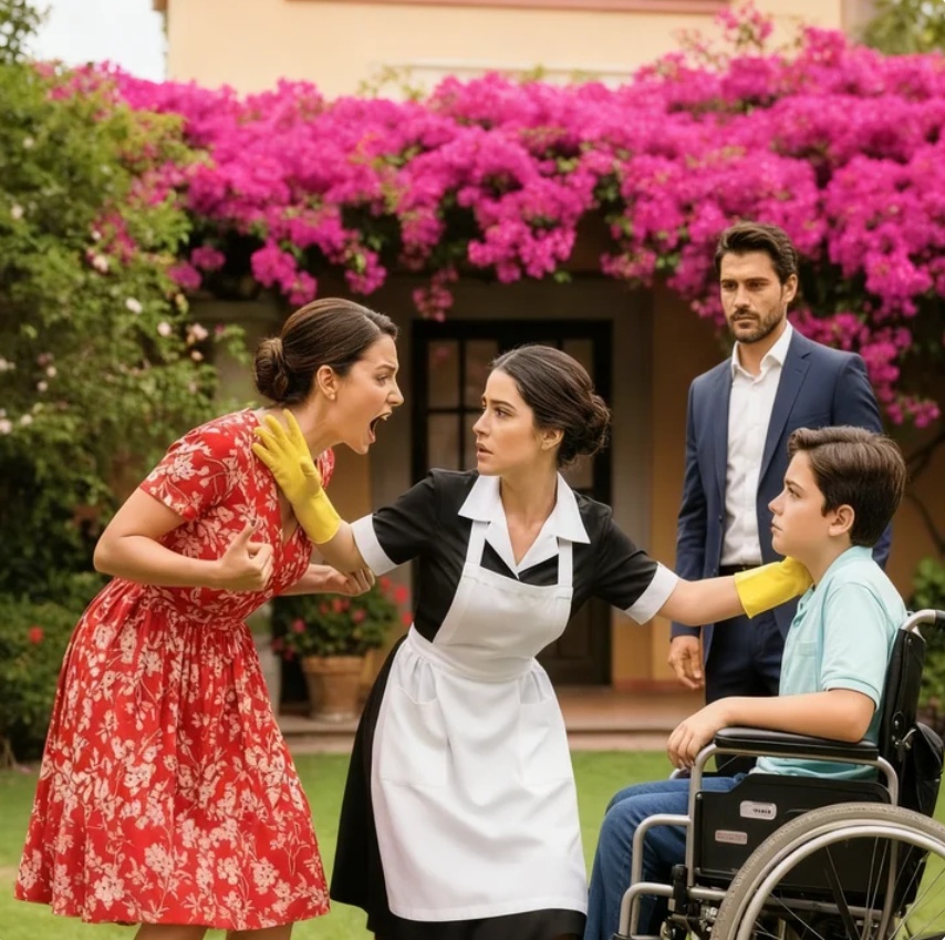Maya, con su uniforme azul impecable, tenía las manos firmemente sujetas en la silla de ruedas de Ethan. No se movía. No retrocedía. Frente a ella, el niño temblaba, su cuerpo frágil encogido como si el mundo fuera demasiado grande para sostenerlo.