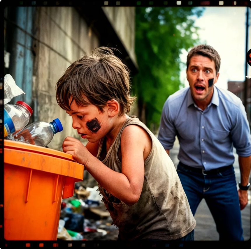 niño de la calle urgando en la basura con las manos temblorosas. Conmovido, se