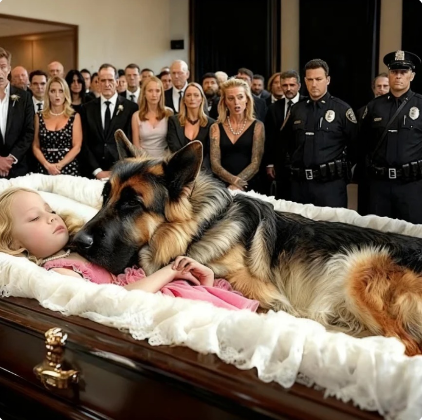 El ataúd blanco, demasiado pequeño, demasiado injusto, tembló levemente cuando el perro cayó dentro. Rex, el pastor alemán más leal del departamento, apoyó su cabeza contra el diminuto hombro de la niña… y se negó a salir.
