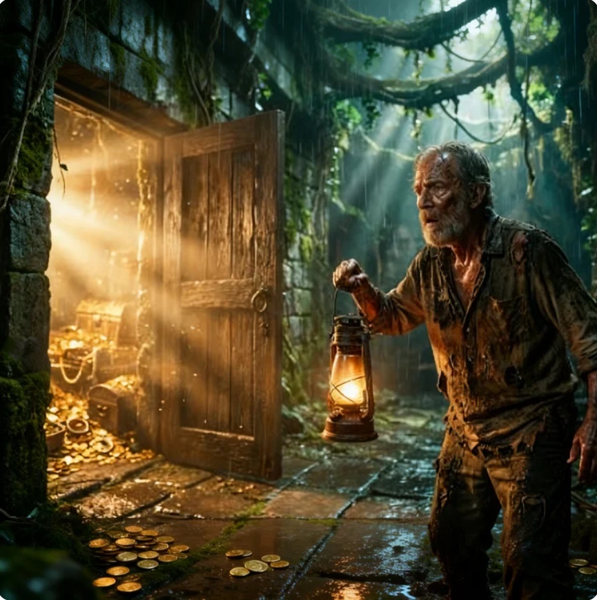 El hombre no sintió codicia. Solo deseaba alimentar a sus hijos. Caminó hasta la cuarta puerta y la abrió. Dentro había montañas de plata brillando como colinas. Tomó un pequeño saco y lo llenó solo con lo que podía cargar cómodamente.