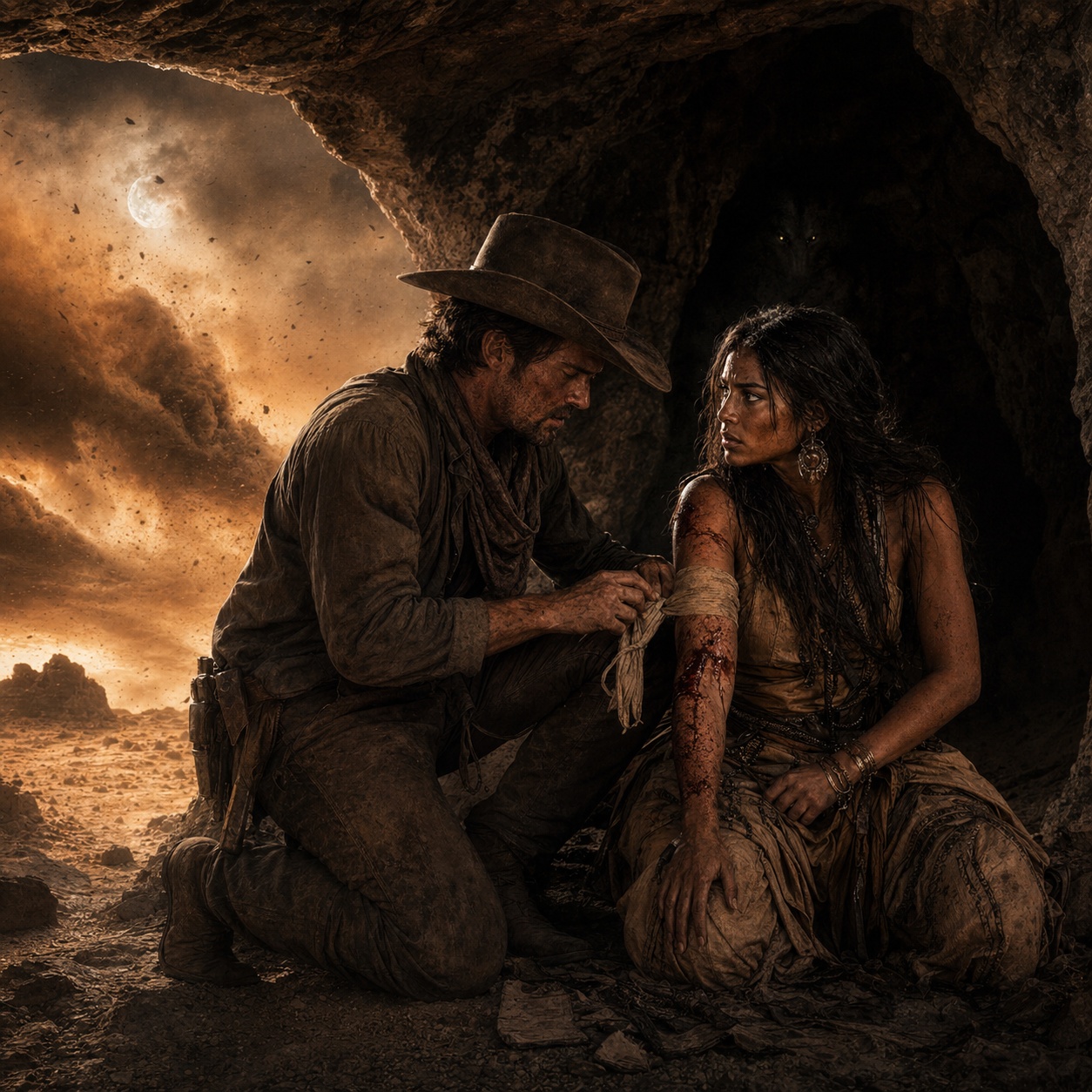 La tormenta de arena cayó de golpe, salvaje, cerrándoles los ojos, arrancándoles el aliento, borrando camino, cielo y mundo. Nayara intentó avanzar a ciegas, pero la arena le golpeaba la cara como cuchillas. El vaquero apenas podía mantenerse en pie, hasta que recordó una grieta en la pared del cañón que había visto horas antes.