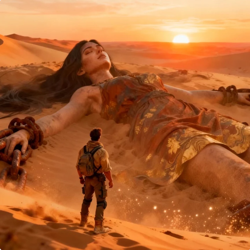 Semienterrada entre cadenas gruesas como troncos de palmera yacía una mujer gigantesca. Medía cerca de diez metros, quizá más. Su piel tenía un tono cálido, ligeramente bronceado, cubierto de polvo antiguo. Llevaba un vestido rasgado de tela fina que alguna vez debió ser hermoso. Su cabello oscuro se extendía alrededor como una catarata nocturna.