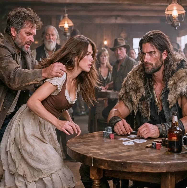El salón Blackwood Crossing olía a whisky barato y tabaco rancio cuando Jebidiah Higgins irrumpió arrastrando a su hija Gwen por la muñeca. La empujó hacia una mesa de tahúres con una sonrisa torcida.