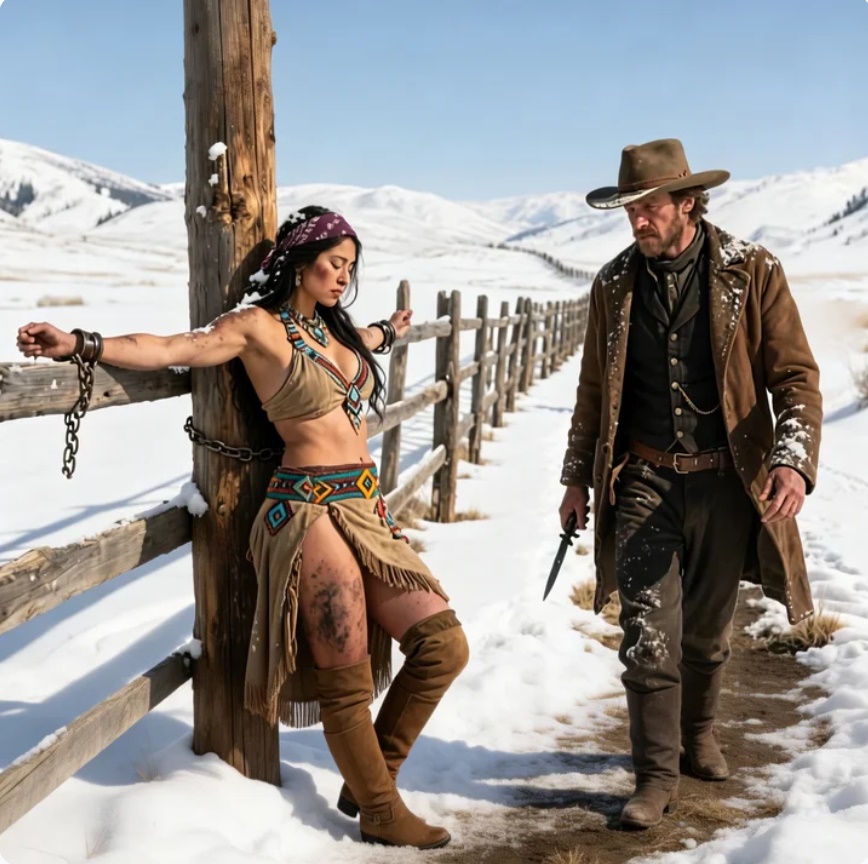 una mujer apache desplomada hacia delante con las muñecas encadenadas al riel superior. Su piel de bronce estaba
