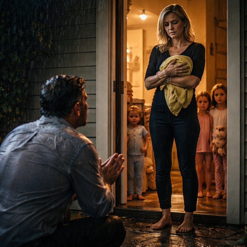 Travis stood there dripping rainwater onto her welcome mat, clutching that faded yellow blanket in both hands like it was the only thing keeping him upright.