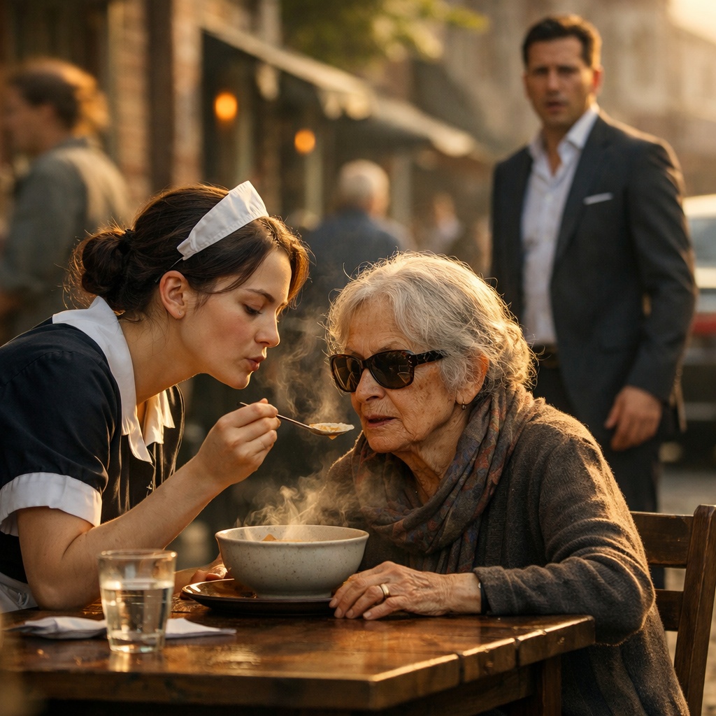 Steam curled gently from the bowl of soup as the maid lifted each spoon, blowing softly before bringing it to the older woman’s lips. Her hands were steady, but her eyes carried something deeper—something almost… personal.