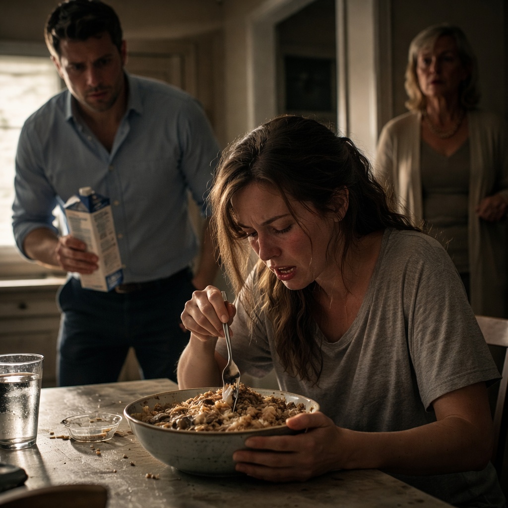 She was holding a large bowl, shoveling food into her mouth like someone afraid it might be taken away. Tears streamed down her face, and every few seconds she glanced toward the doorway like she was expecting to be caught.