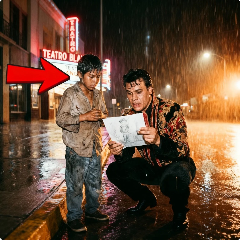 Daniel se acercó lentamente y extendió el dibujo. Juan Gabriel lo sostuvo con cuidado para protegerlo de la lluvia y lo observó bajo la luz de la calle. Sus ojos recorrieron cada sombra, cada línea.