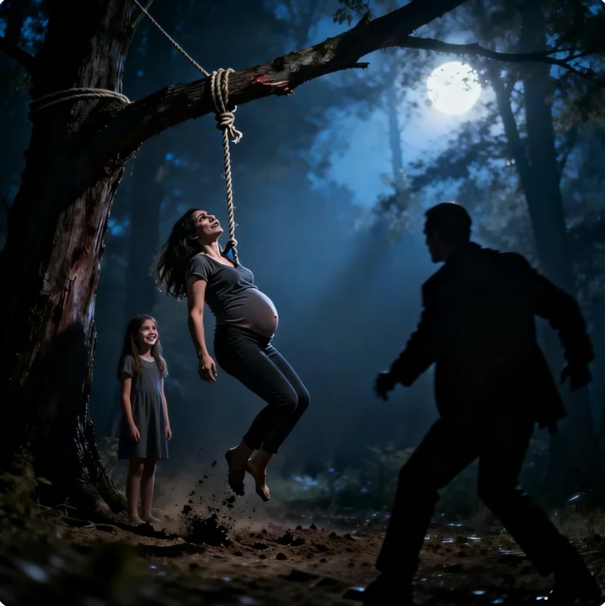 Una esposa embarazada es atada y levantada del suelo mientras la cuerda se tensa y su respiración comienza a