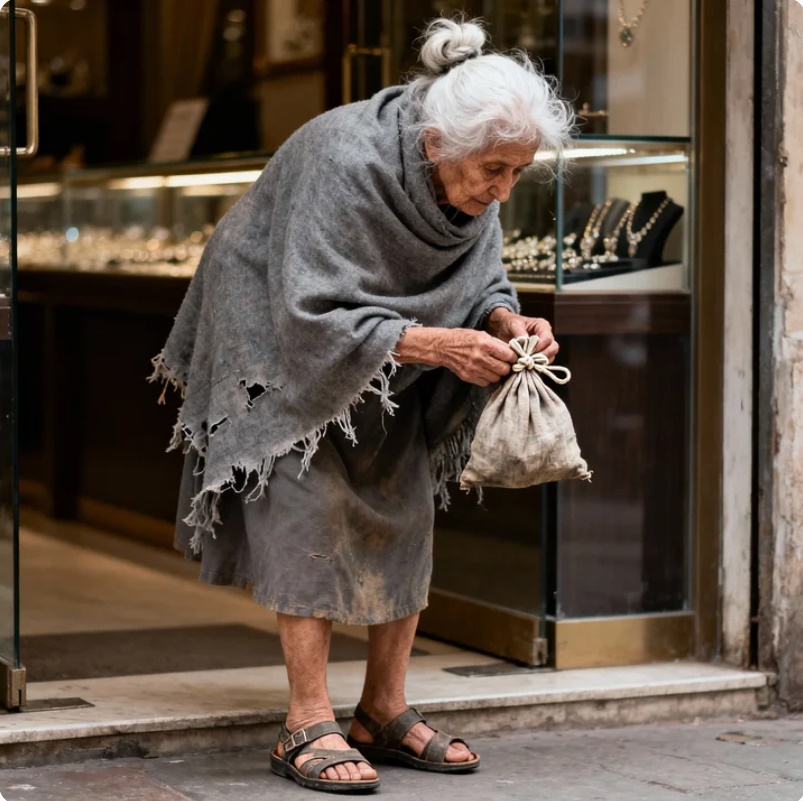 La anciana entró a la joyería arrastrando ligeramente los pies.