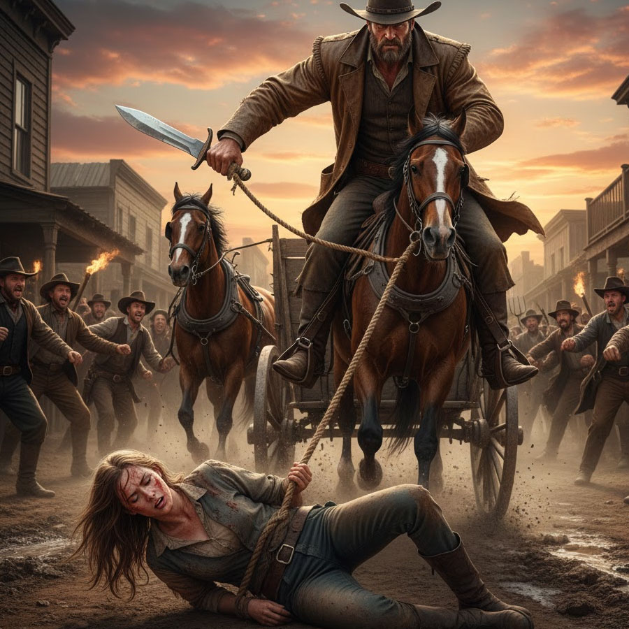 La arrastraron por el pueblo en una cuerda atada a un carro, mientras la música de una feria lejana sonaba como una burla cruel. Las ruedas chirriaban sobre la tierra seca y cada sacudida hacía que la cuerda alrededor de su cintura se tensara un poco más.