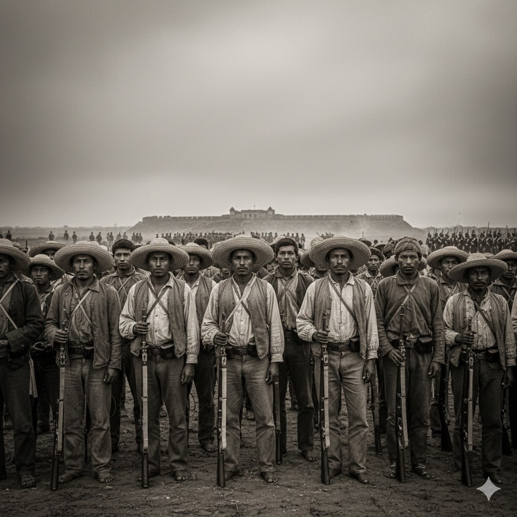 Frente a los fuertes de Loreto y Guadalupe, los soldados mexicanos esperaban en silencio. No eran un ejército poderoso. Vestían ropa gastada, cargaban fusiles viejos, y algunos apenas sabían escribir su nombre. Venían de pueblos, de campos y de montañas: campesinos, artesanos, indígenas, jóvenes sin experiencia. Hombres que no soñaban con gloria, sino con defender lo poco que tenían: su tierra y su dignidad.