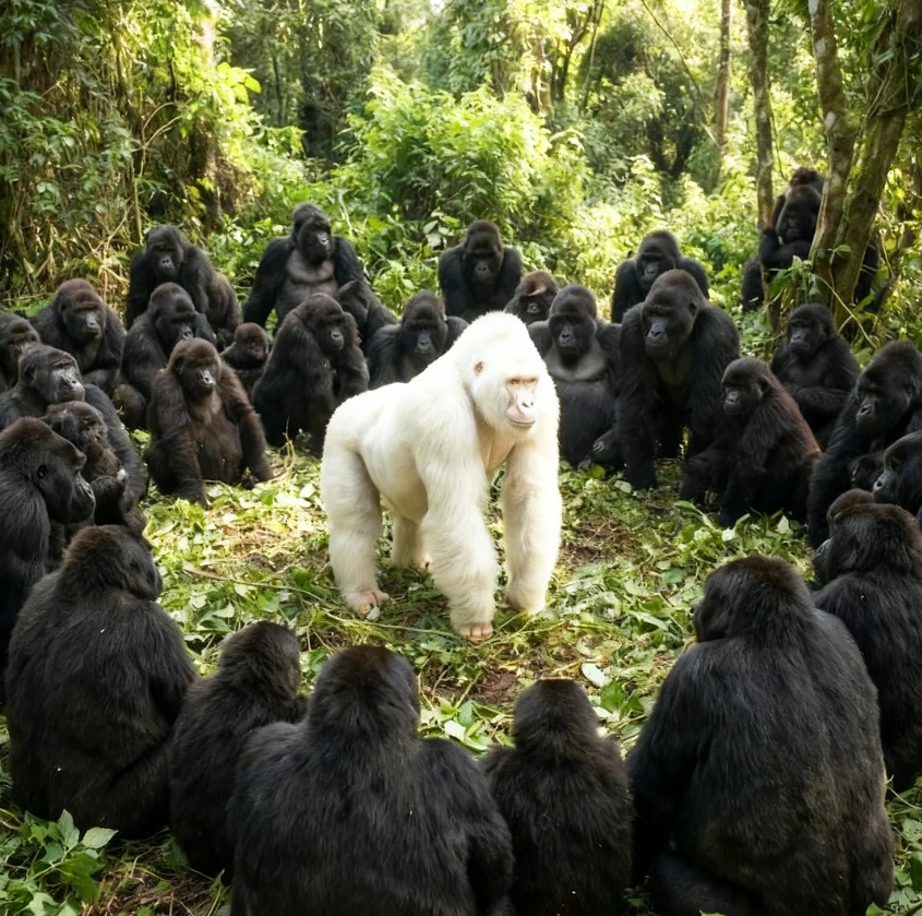 Su pelaje fino, todavía pegado al cuerpo por el nacimiento reciente, parecía hecho de luz húmeda. Los párpados apenas abiertos dejaban ver unos ojos rosados, pálidos, casi irreales. En el suelo oscuro del bosque, aquella cría no parecía una criatura del grupo. Parecía un error visible. Una anomalía demasiado brillante para sobrevivir.