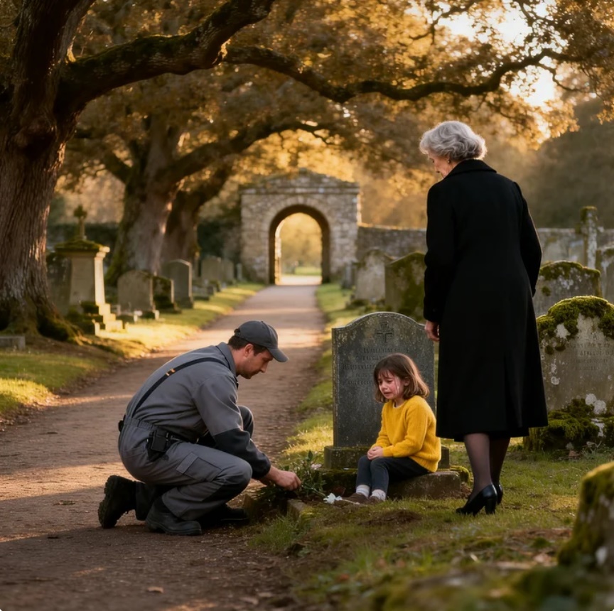 A man in a janitor’s uniform was kneeling beside Emma’s tombstone.