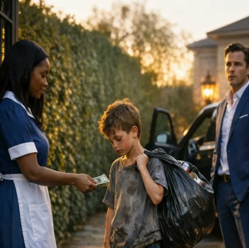Marcus detuvo el coche sin pensarlo. No fue una decisión racional, fue un impulso. Al otro lado de la calle, Elena, la mujer que limpiaba su casa dos veces por semana, estaba frente a un niño que sostenía una bolsa de basura llena de latas aplastadas. Sin decir mucho, ella le entregó un billete doblado.
