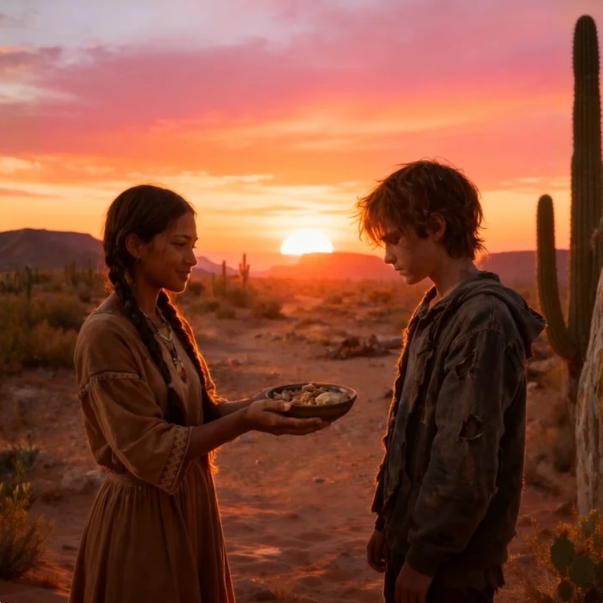 Un muchacho delgado, con la ropa rasgada y el rostro cubierto de polvo, estaba acurrucado junto a un cactus. Sus labios estaban resecos, su respiración era débil. Cuando abrió los ojos, ella vio una mirada vacía… la mirada de alguien que había perdido demasiado siendo aún tan joven.