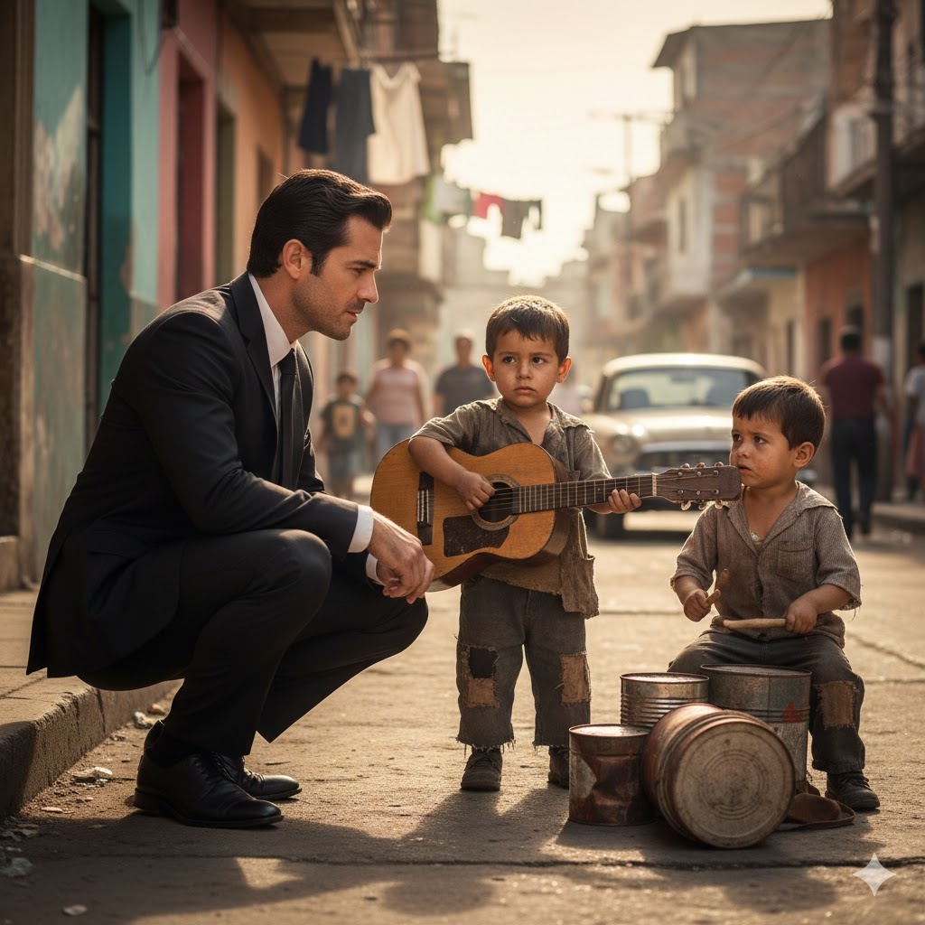 niños en situaciones duras aprenden demasiado pronto. Rafael apretó la guitarra contra el pecho en un gesto
