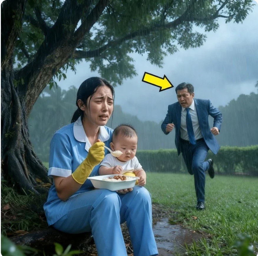Millonario encuentra a su criada almorzando bajo la lluvia. Al descubrir el motivo, queda devastado.