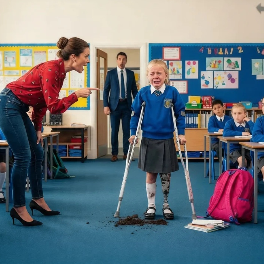 Martina, de apenas seis años, sostenía con fuerza sus muletas metálicas mientras intentaba no temblar. Su pierna ortopédica asomaba bajo el uniforme escolar como una prueba silenciosa de todas las batallas que ya había librado a una edad en la que otros niños solo deberían preocuparse por los colores de sus crayones o por quién les tocaría al lado en el recreo. A sus pies, la tierra derramada manchaba el piso. Su mochila rosa yacía abierta, con los cuadernos desparramados alrededor como si alguien hubiera querido exhibirla ante todos.