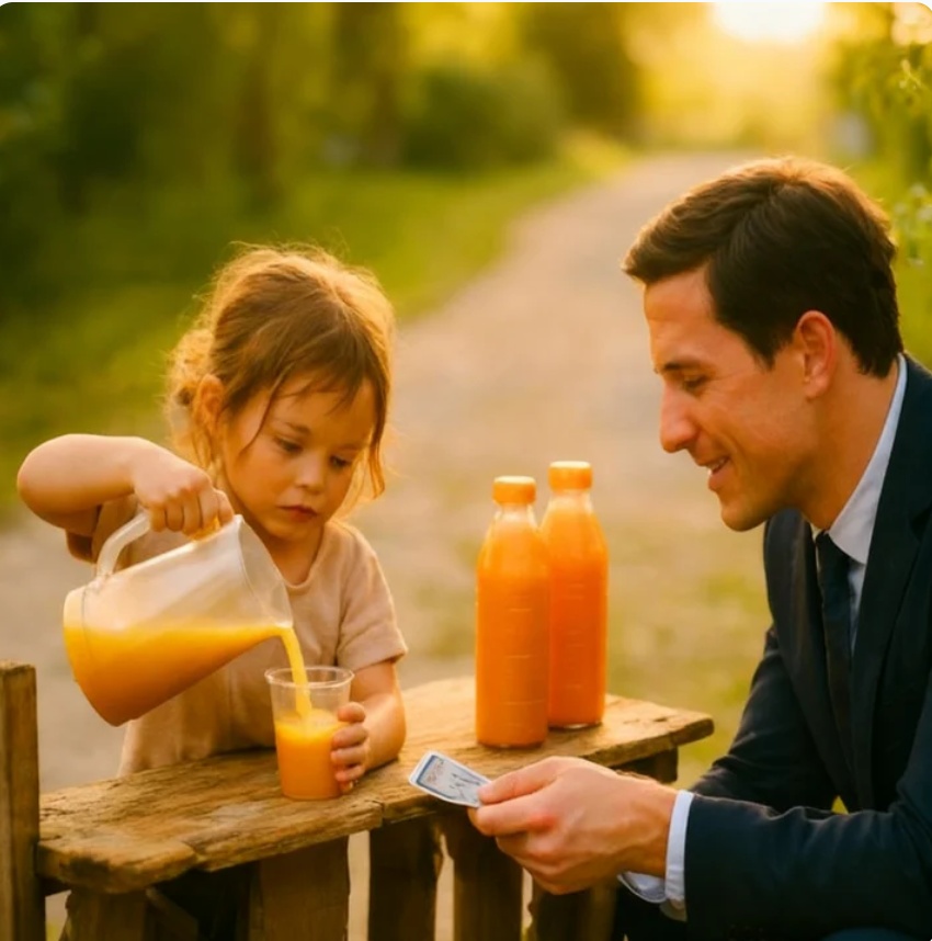 Una niña pequeña, no mayor de seis años, estaba sentada junto a una mesa rústica de madera. Sobre ella, varias botellas de jugo de naranja brillaban bajo el sol como pequeños tesoros. Sus piernas se balanceaban con paciencia, como si el tiempo no tuviera prisa.