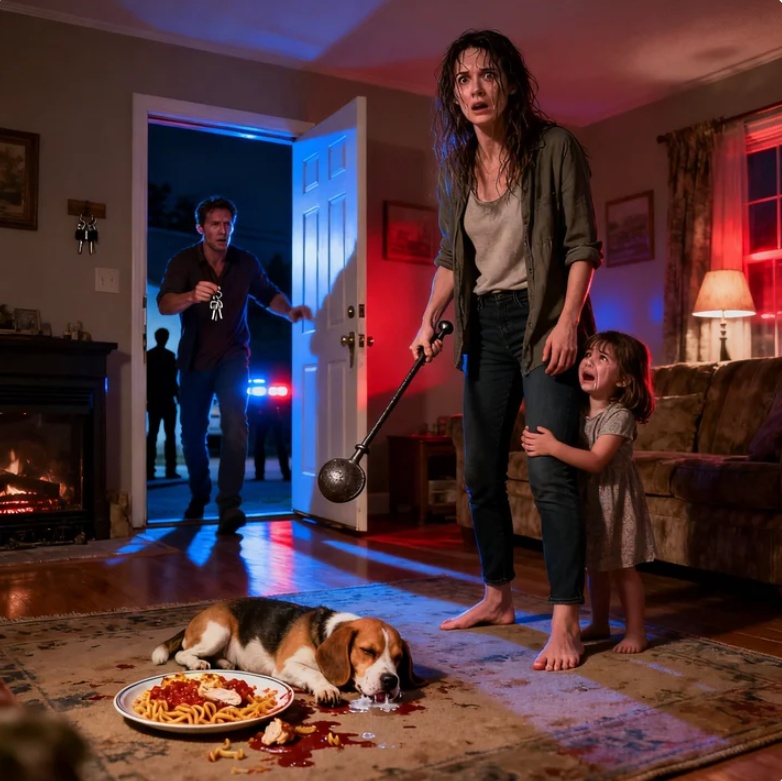 One look at the room told the story in fragments no one could miss: the dead dog, the spilled food, my daughter clinging to me, my husband on the floor, and me standing there barefoot with a fireplace poker in my hand like I’d crawled out of the worst hour of my life.