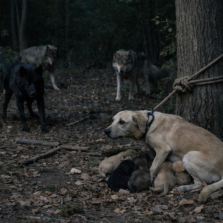 Las figuras avanzaban despacio entre los árboles, silenciosas, casi flotando. Luna tensó el cuerpo como pudo, aunque la cuerda seguía clavándosele en el cuello. Gruñó bajo, apenas un susurro, intentando advertir a aquello que se acercaba que no se rindiría sin pelear. Los cachorros, pegados a su vientre, percibieron el cambio y se quedaron inmóviles, con los ojos muy abiertos.