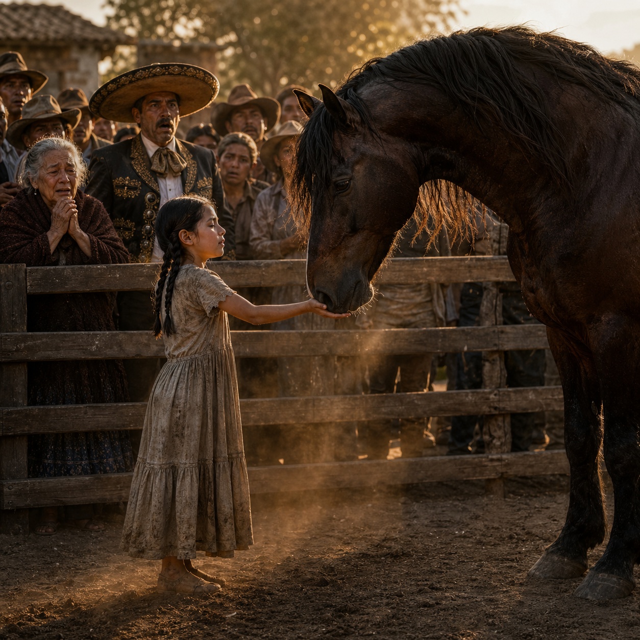 Los vaqueros gritaron. María lloró. Don Manuel ordenó que nadie se moviera. El caballo estaba en la esquina opuesta, respirando con pánico. Sofía caminó hasta el centro, se sentó en el suelo y empezó a cantar.